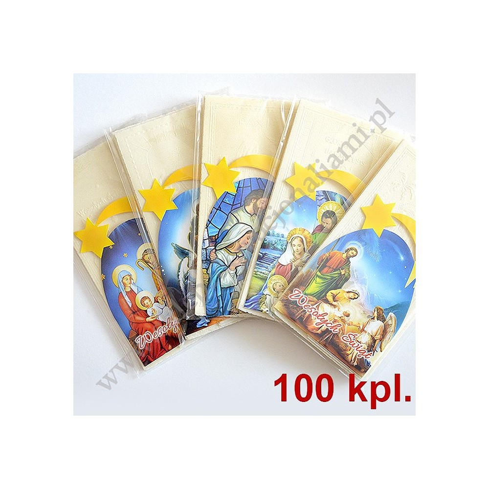 100 KOMPLETÓW. Jeden komplet opłatków wigilijnych składa się z trzech dużych opłatków (format 10 x 18 cm) oraz dwóch małych opłatków (format 6 x 10 cm) pakowanych w folijce z kolorowym obrazkiem bożonarodzeniowym.
