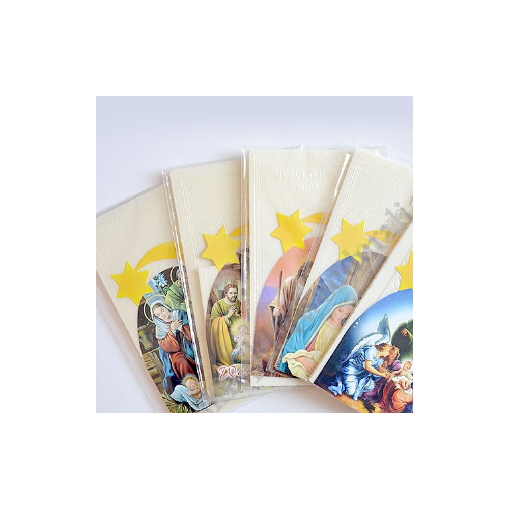 Komplet opłatków wigilijnych składający się z trzech dużych opłatków (format 10 x 18 cm) oraz dwóch małych opłatków (format 6 x 10 cm) pakowanych w folijce z kolorowym obrazkiem bożonarodzeniowym.