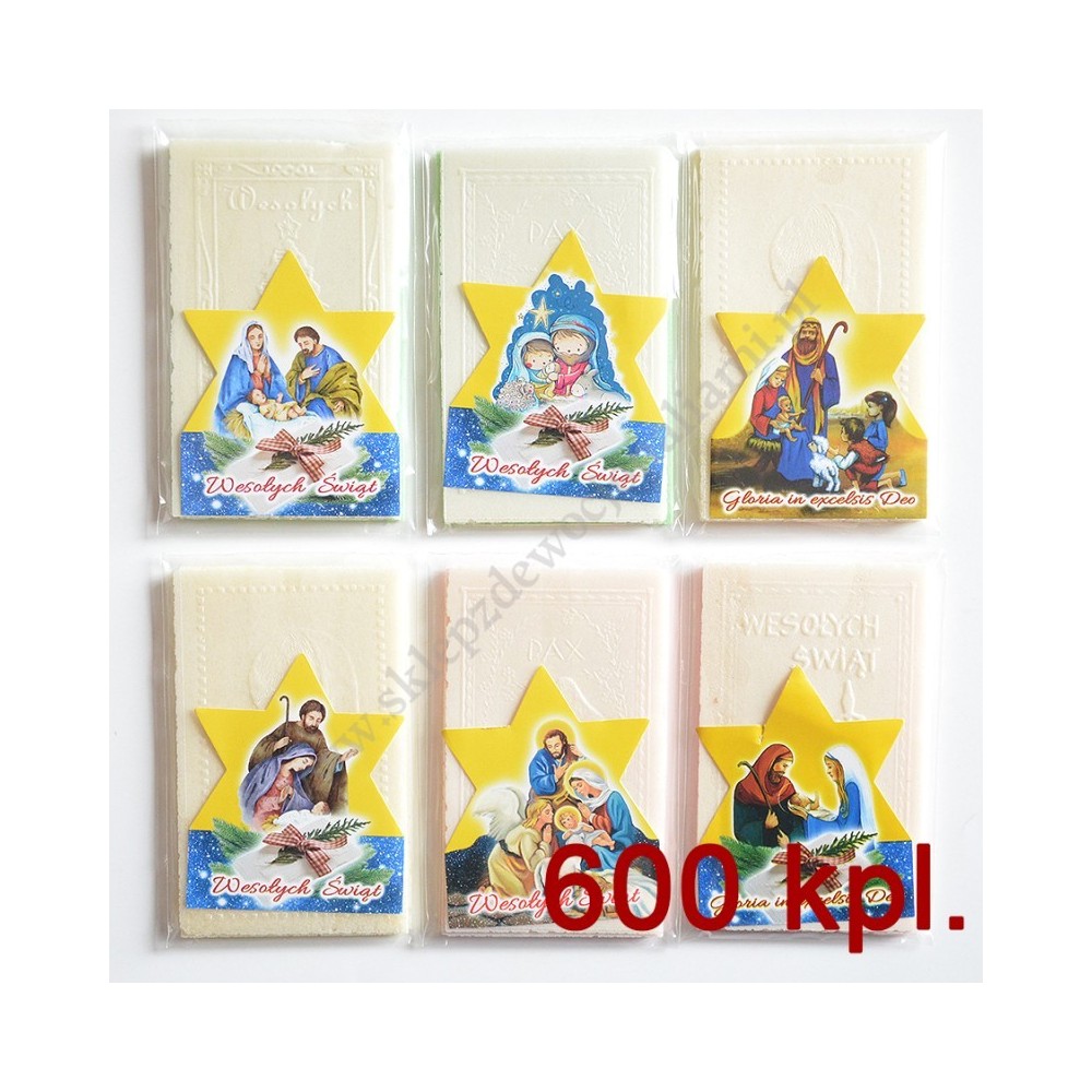 600 KOMPLETÓW. Jeden komplet opłatków wigilijnych składa się z trzech małych opłatków oraz jednego małego kolorowego (dla zwierząt), format opłatków 6 x 10 cm, pakowanych w folijce z kolorowym obrazkiem bożonarodzeniowym.