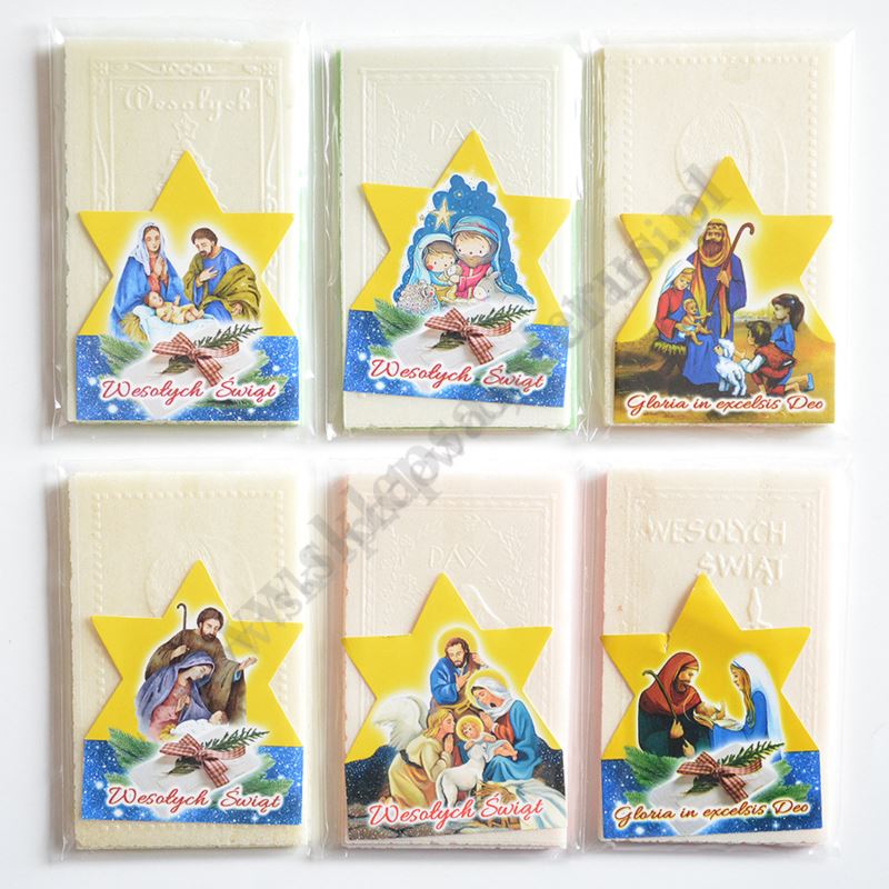 Komplet opłatków wigilijnych składający się z trzech małych opłatków oraz jednego małego kolorowego (dla zwierząt), format opłatków 6 x 10 cm, pakowanych w folijce z kolorowym obrazkiem bożonarodzeniowym.
