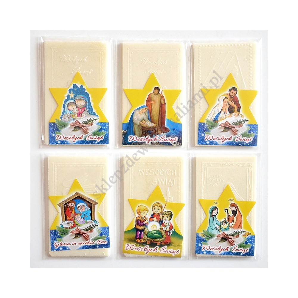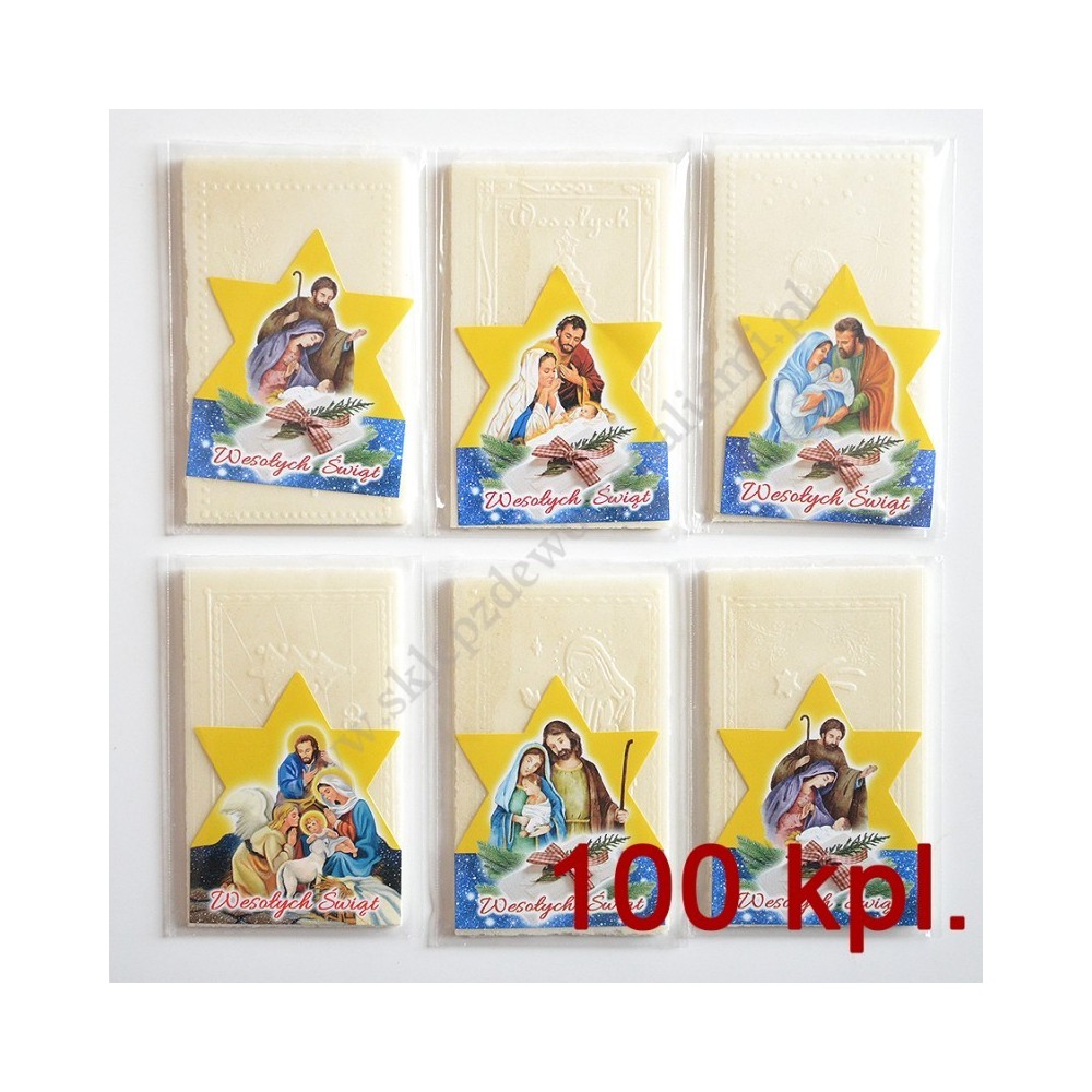 100 KOMPLETÓW. Jeden komplet opłatków wigilijnych składa się z trzech małych opłatków w formacie 6 x 10 cm, pakowanych w folijce z kolorowym obrazkiem bożonarodzeniowym.