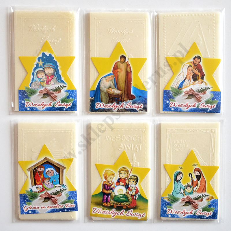 Komplet opłatków wigilijnych składający się z trzech małych opłatków w formacie 6 x 10 cm, pakowanych w folijce z kolorowym obrazkiem bożonarodzeniowym.