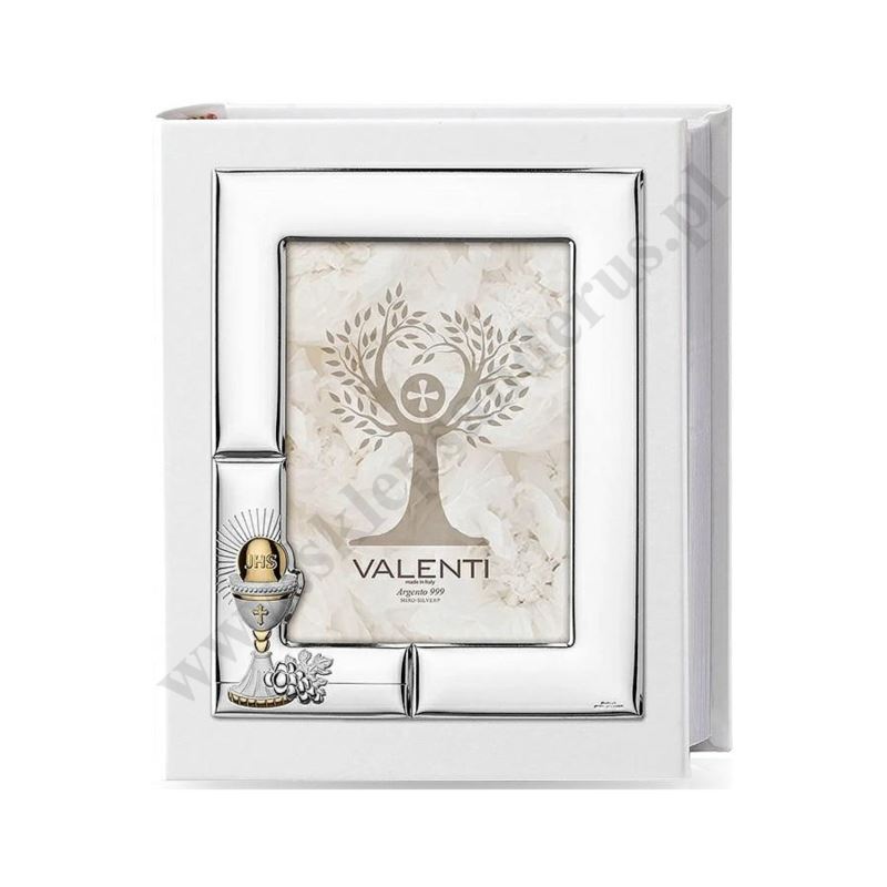 Komunijny album na zdjęcia, zdobiony srebrną ramką z akcentem eucharystycznym. Format 24 x 31 cm.