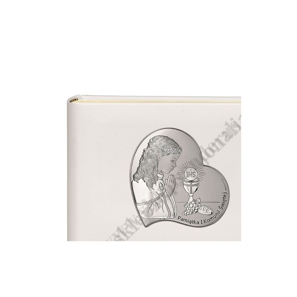 Komunijny album na zdjęcia dla dziewczynki, zdobiony srebrnym obrazkiem na okładce. Format 21 x 15 cm. Stron na zdjęcia: 30.