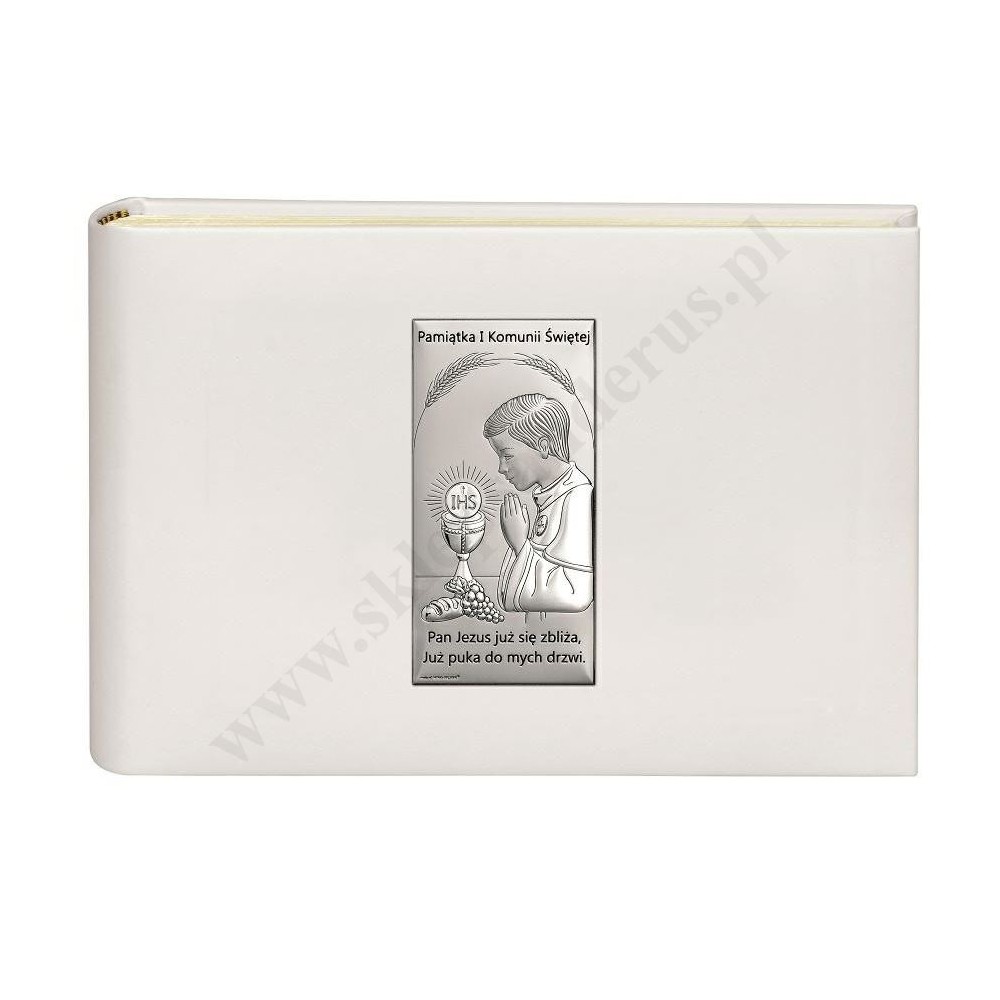 Komunijny album na zdjęcia dla chłopca, zdobiony srebrnym obrazkiem na okładce. Format 21 x 15 cm. Stron na zdjęcia: 30.