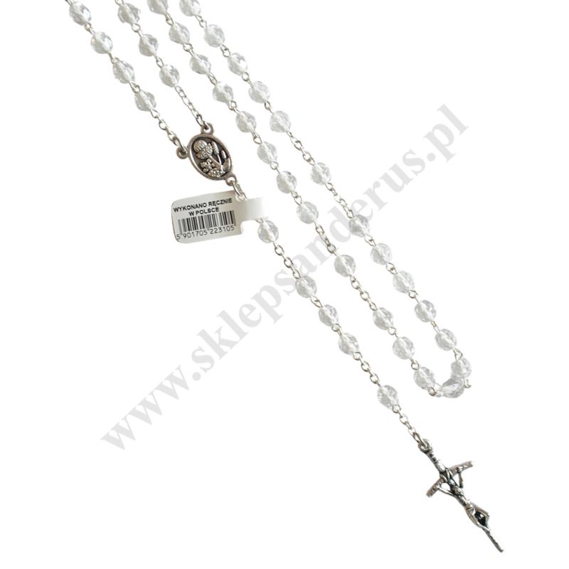 Różaniec komunijny o długości ok. 45 cm i średnicy koralika ok. 6 mm.