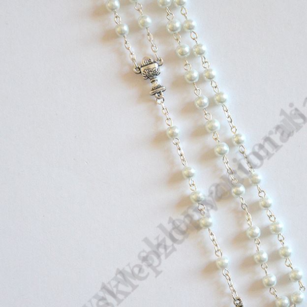 Różaniec komunijny o długości 48 cm, łącznik kielich, krzyżyk papieski, koralik wykonany z tworzywa sztucznego.
