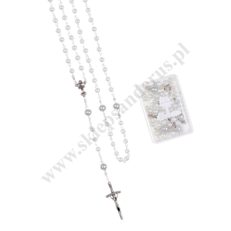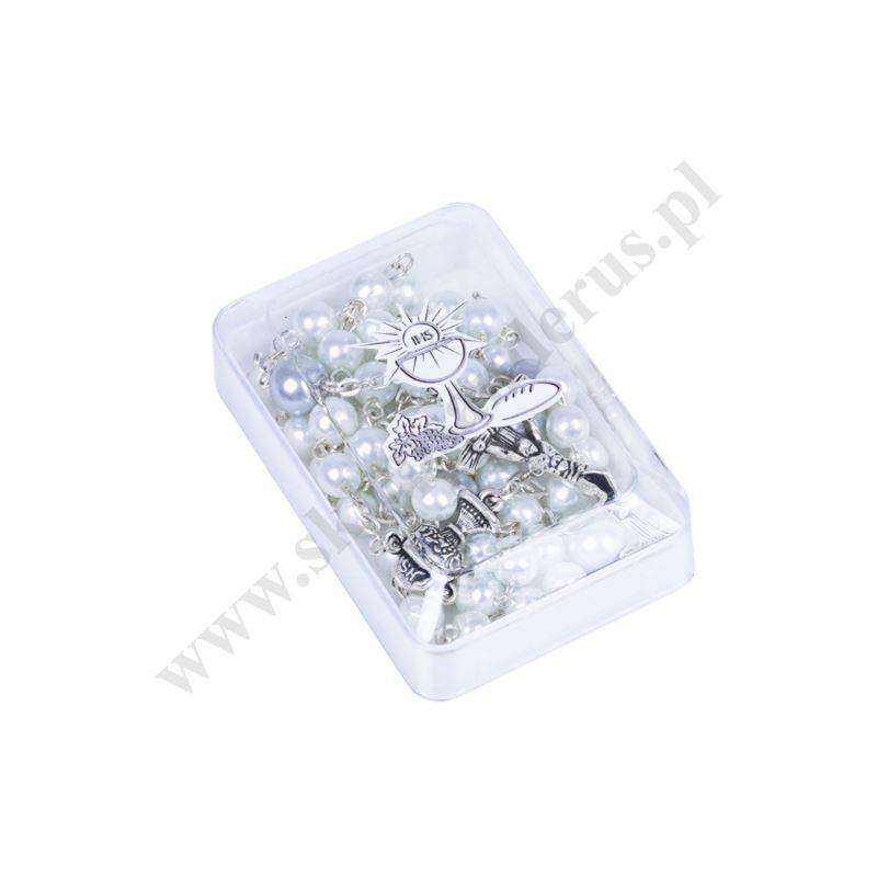 Różaniec komunijny w plastikowym pudełeczku o długości 47 cm i średnicy koralika 6 mm