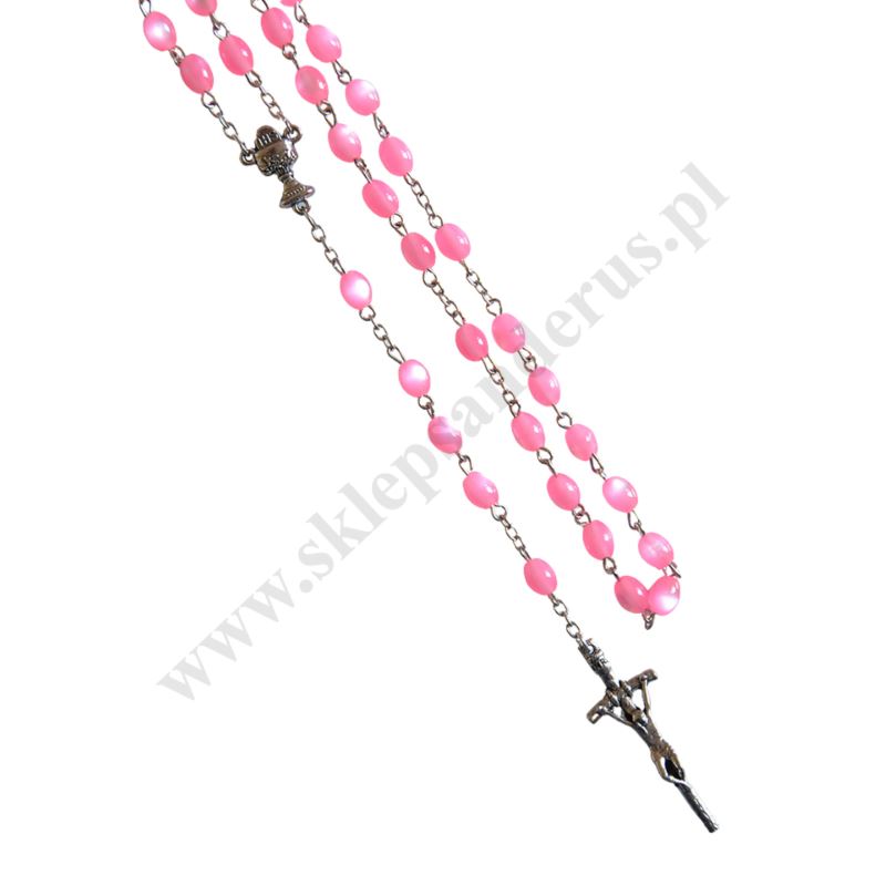 Różaniec komunijny wykonany z metalu i tworzywa sztucznego o długości ok. 56 cm, wymiar koralika 8 x 5 mm.