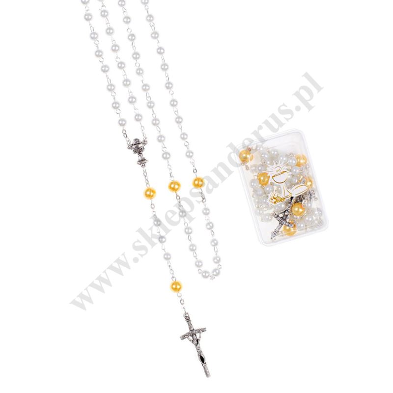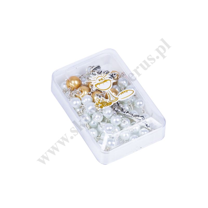 Różaniec komunijny w plastikowym pudełeczku o długości 47 cm i średnicy koralika 6 mm