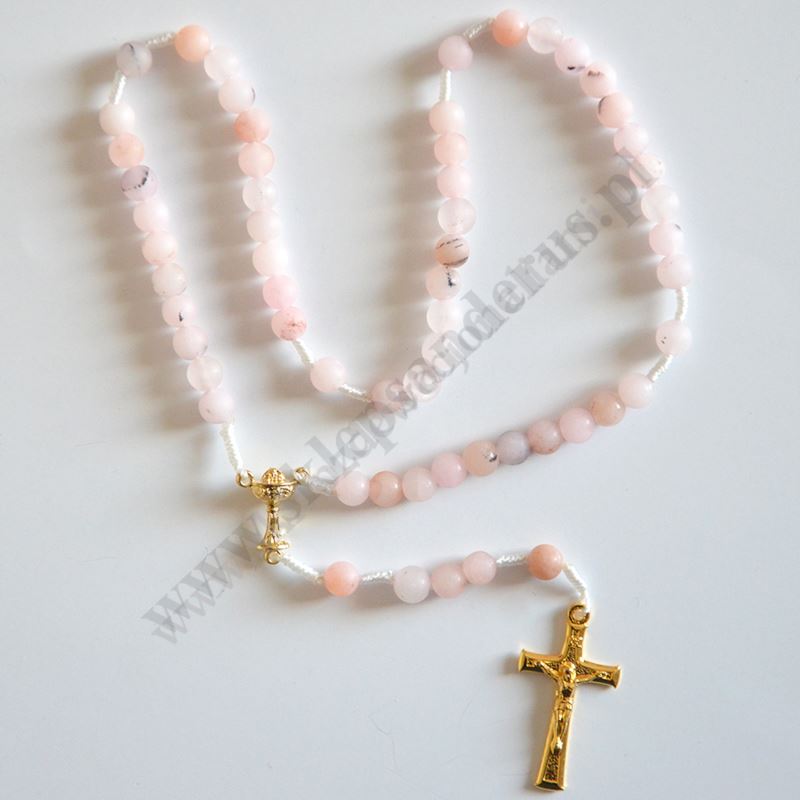 Różaniec komunijny na sznurku, koraliki wykonane z kamienia półszlachetnego, krzyży i łączniki metalowe. Długość różańca ok 30 cm, średnica koralika 5 mm.