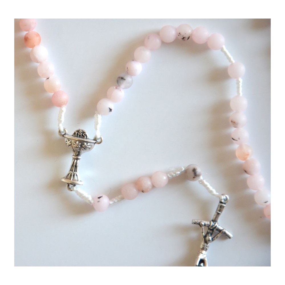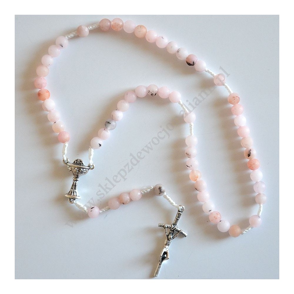 Różaniec komunijny na sznurku, koraliki wykonane z kamienia półszlachetnego opal różowy, krzyżyk i łączniki metalowe. Długość różańca 32 cm, średnica koralików ok 6 mm.