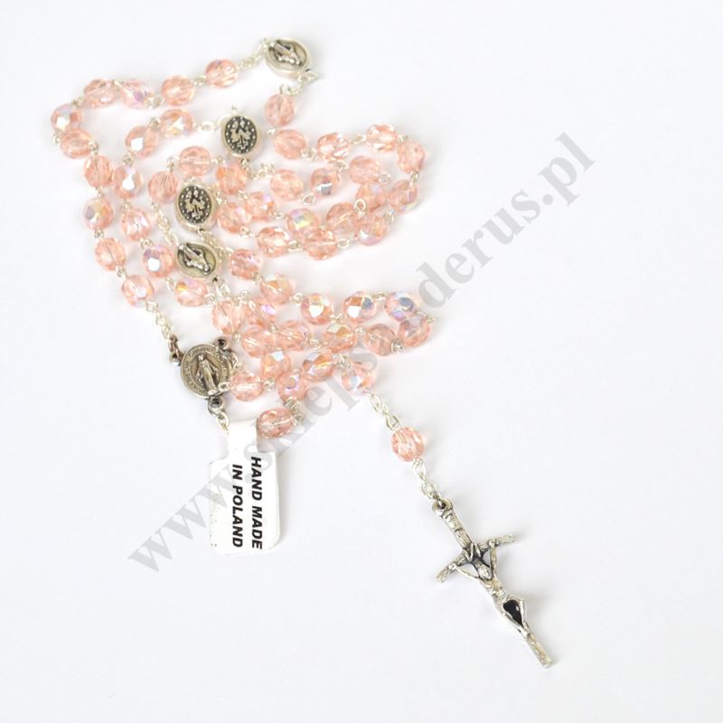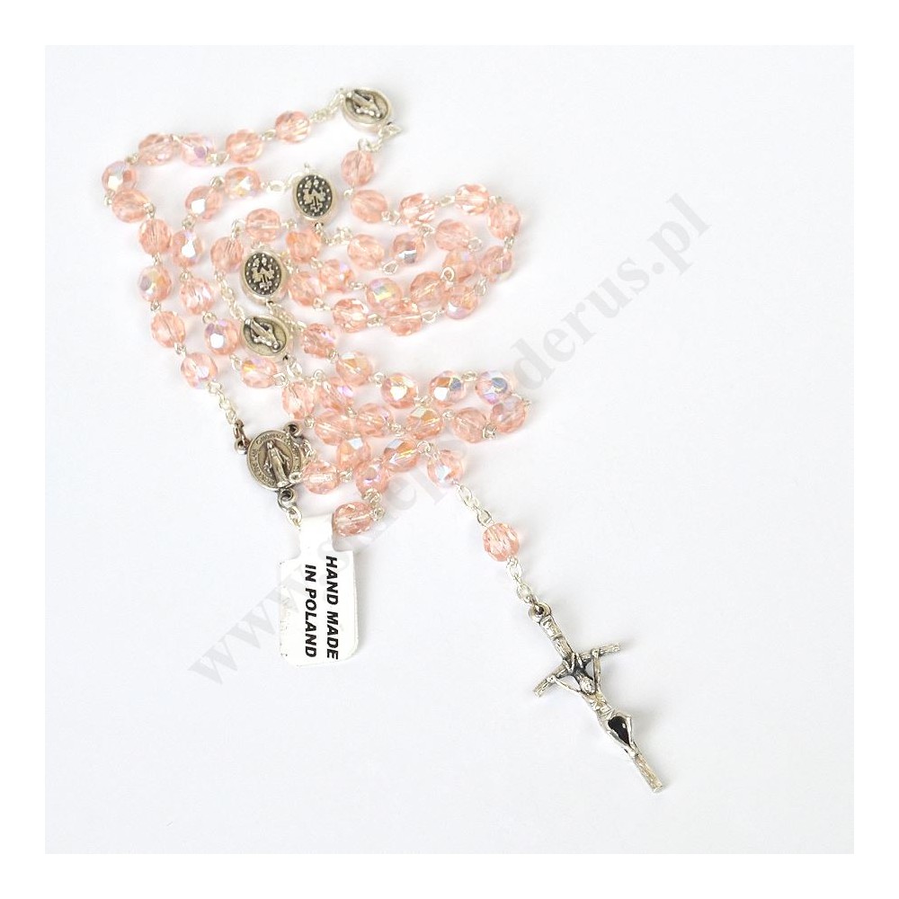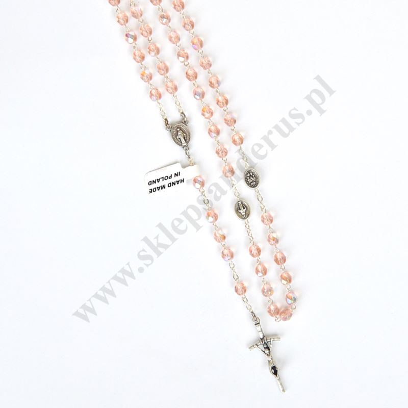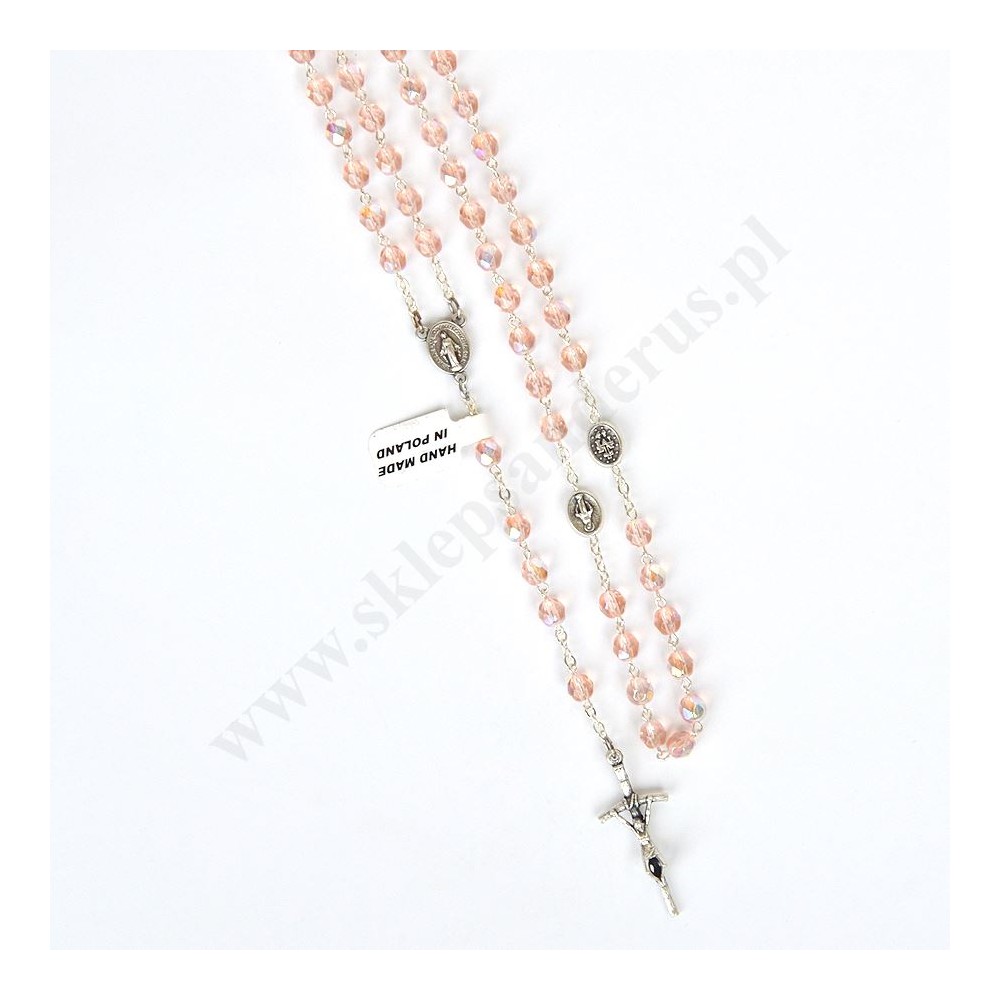 Różaniec wykonany z różowego kryształu i metalu. Długość różańca 46 cm, średnica koralika ok. 6 mm.