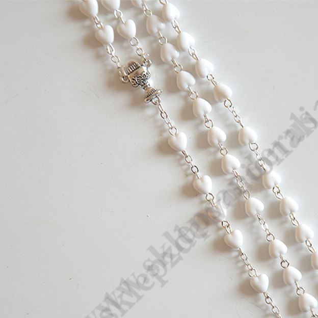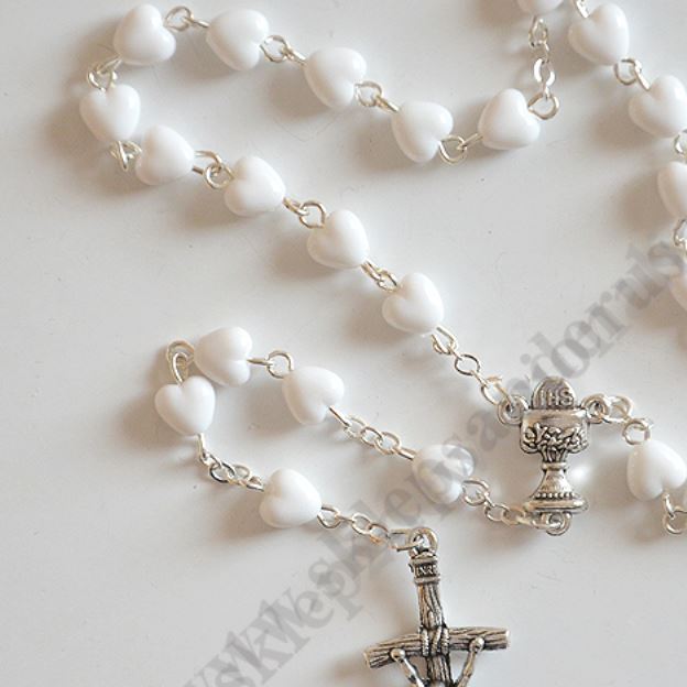 Różaniec komunijny serca białe o długości 50 cm, łącznik kielich eucharystyczny, krzyżyk papieski.