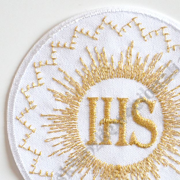 Materiałowa hostia do naszycia z komputerowym haftem IHS. Średnica hosti 8.5 cm