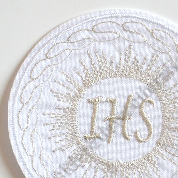 Materiałowa hostia do naszycia z komputerowym haftem IHS. Średnica hosti 8.2 cm.