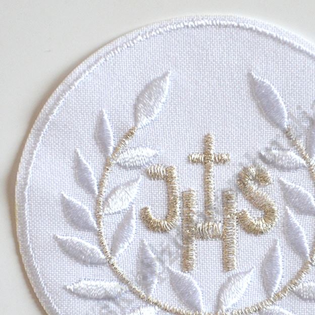 Materiałowa hostia do naszycia z komputerowym haftem IHS. Średnica hosti 8.5 cm.