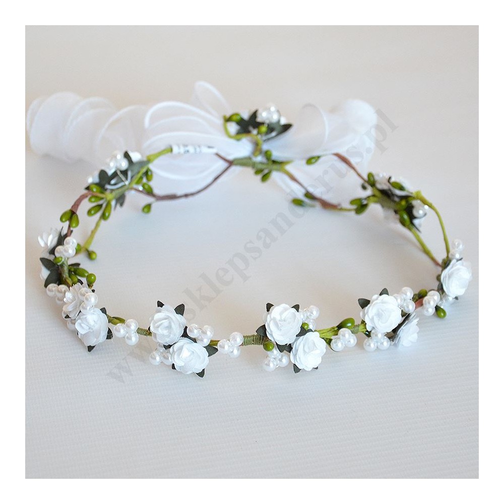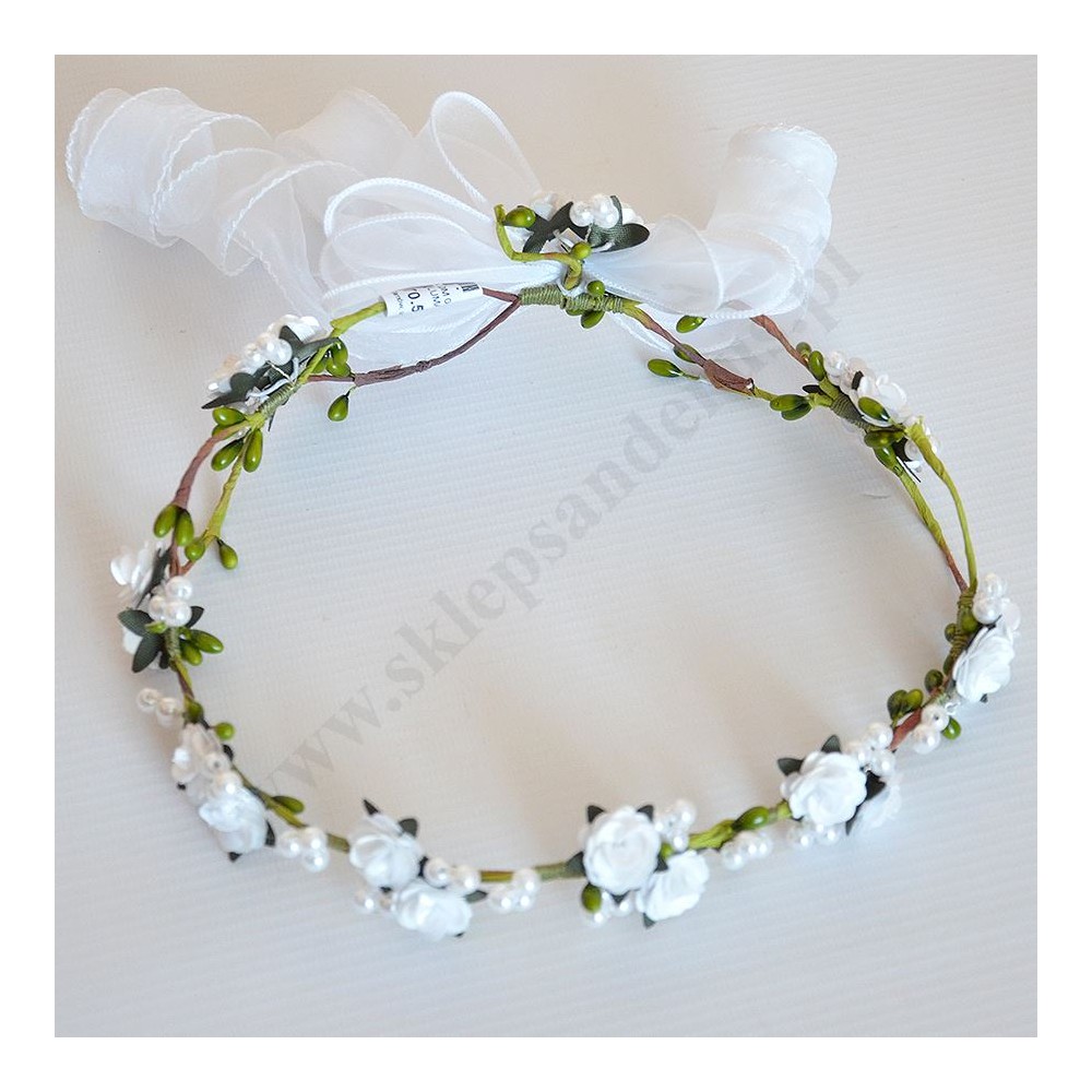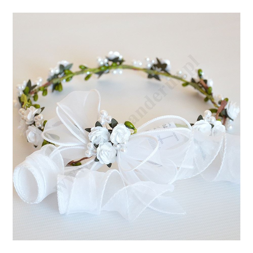 Wianek komunijny wykonany z różyczek otoczonych perłowymi koralikami na konstrukcji z zielonych gałązek uwieńczone delikatnymi organdynowymi lokami.