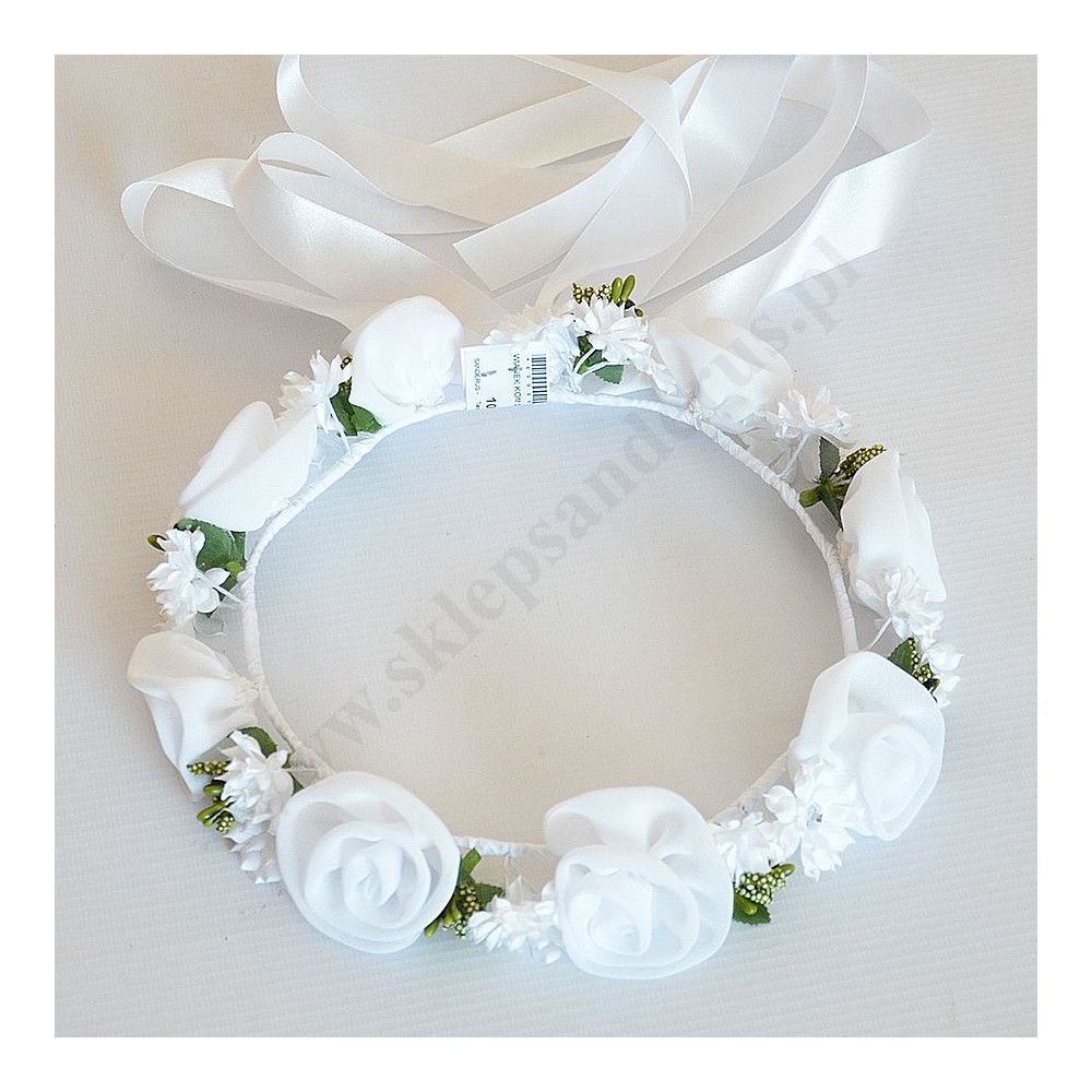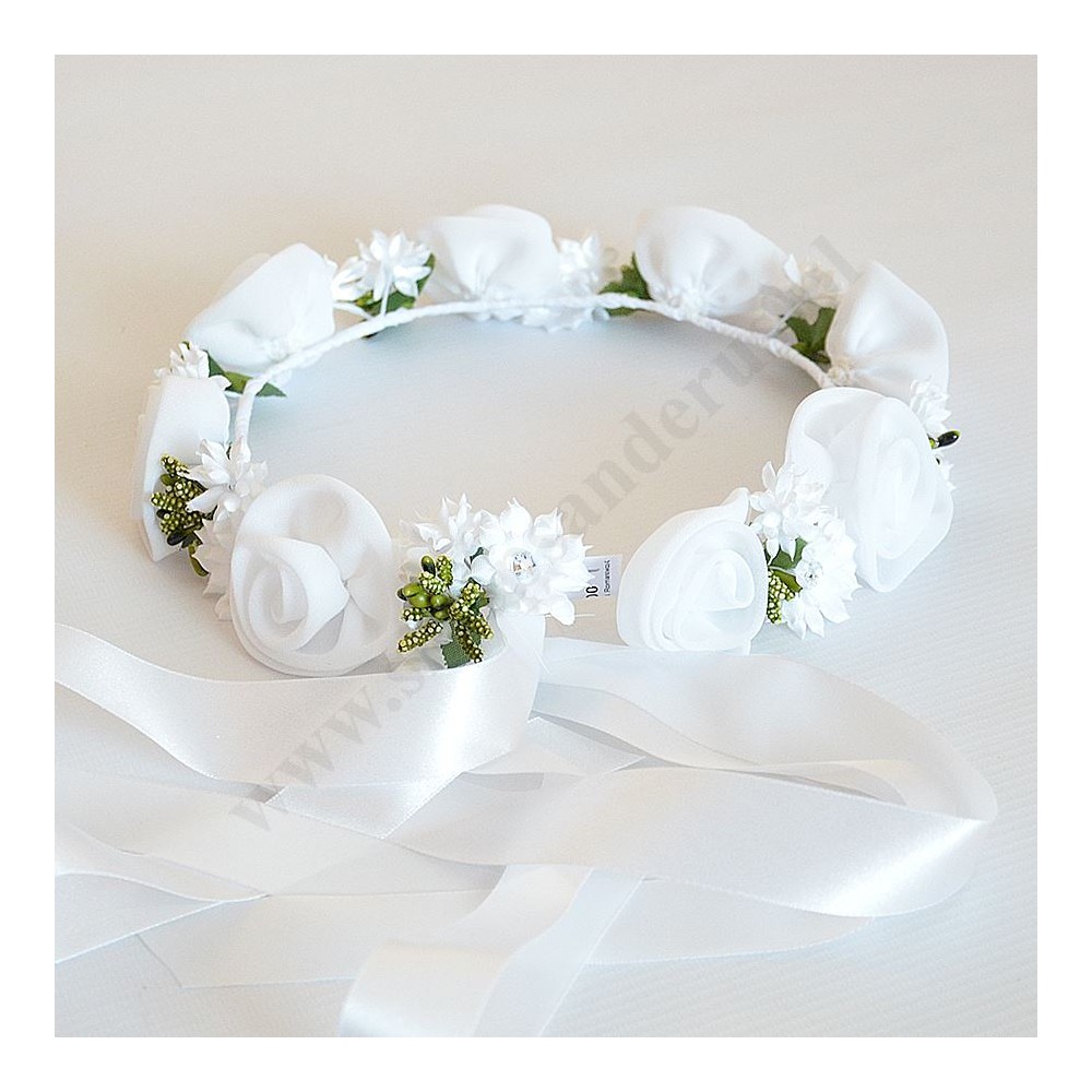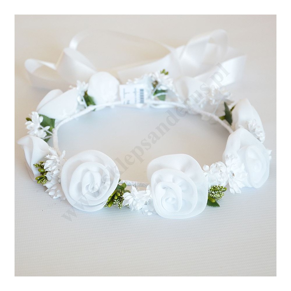 Wianek komunijny skromny przód wykonany z białych i różowych papierowych różyczek tył wzbogacony o piankowe róże, całość wykończona kokardą z atłasowych wstążek.
