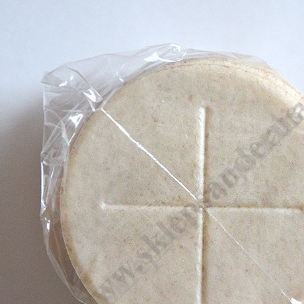Hostie razowe o średnicy 65 mm i grubości 1.7 mm ze znakiem krzyża, krawędzie zasklepione.