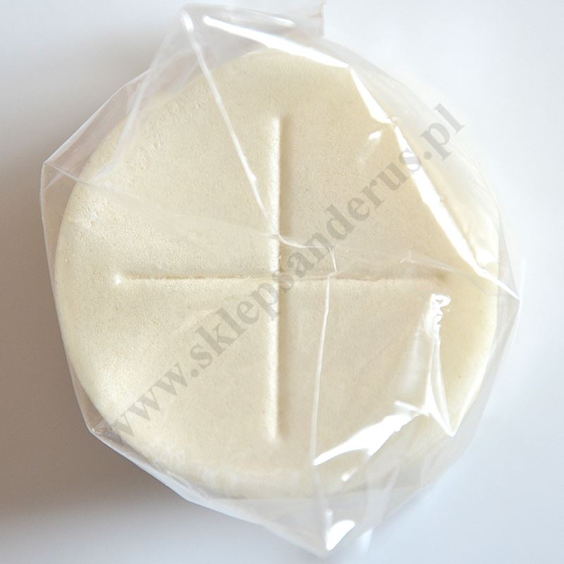 Hostie o średnicy 60 mm, białe z obustronnym znakiem krzyża, zasklepione brzegi, grubość 1.7 mm. Pakowane po 50 szt. w woreczku.
