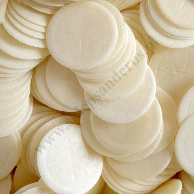 Komunikanty średnie o średnicy 3.4 cm i grubości 1.2 mm. Obustronny znak krzyża oraz zasklepione krawędzie zewnętrzne uniemożliwiają kruszenie. Pakowana po 1000 szt.
