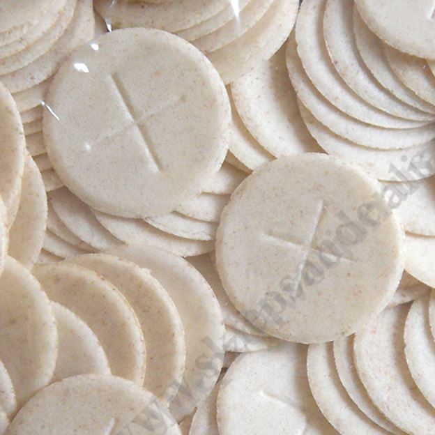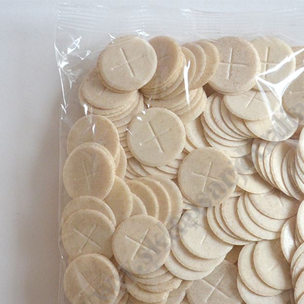 Komunikanty razowe o średnicy 3.8 cm i grubości 1.7 mm z zasklepionymi krawędziami.