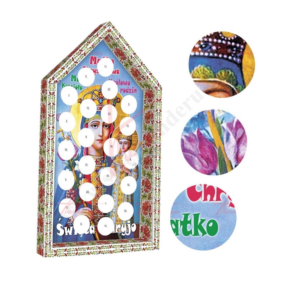 Wyklejanka majowa - kapliczka Matki Bożej. Wykonana z kartonu, trójwymiarowa. W zestawie 23 naklejki do uzupełnienia tła. Sprzedaż w kompletach po 10 szt.
