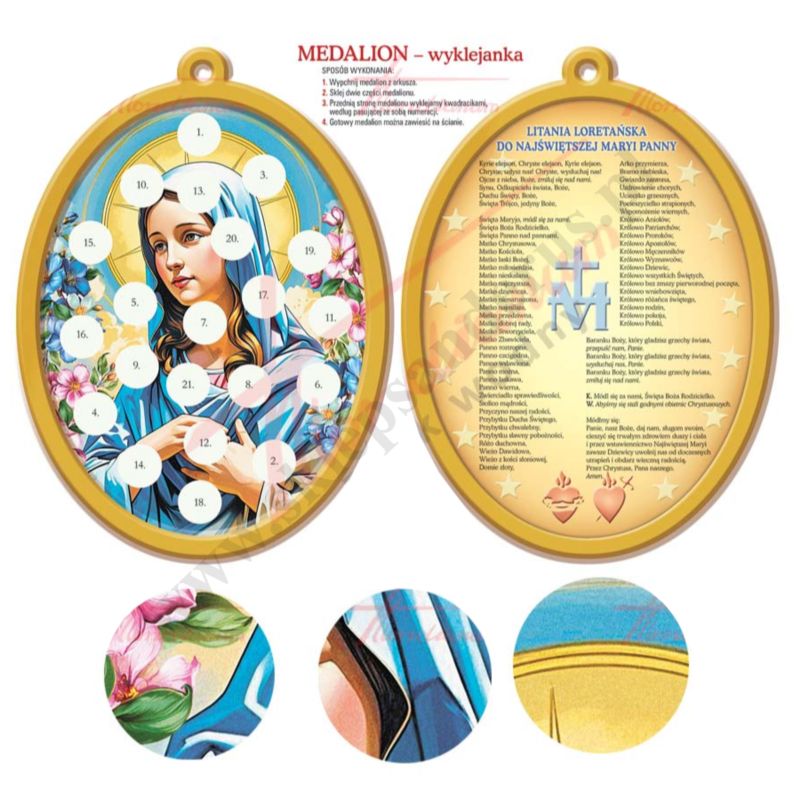 Do wyklejenia 21 kółeczek, które tworzą piękny majowy medalion z wizerunkiem Najświętszej Maryi Panny. Na odwrocie zamieszczony został tekst litanii loretańskiej. Format 32 x 23 cm. Sprzedaż w kompletach po 10 szt.