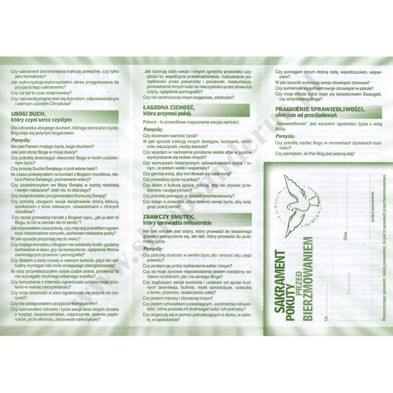 Przejrzysty rachunek sumienia dla osób mających przystąpić do sakramentu bierzmowania został oparty na Ośmiu Błogosławieństwach. Zachowano tradycyjną formę pytań, na które trzeba sobie odpowiedzieć przed przystąpieniem do sakramentu pokuty. Rachunek sumienia zawiera także modlitwę wstępną do Ducha Świętego, na końcu akt żalu, a także kartkę potwierdzającą przystąpienie do spowiedzi świętej przed przyjęciem bierzmowania. Na jej odwrocie znajduje się formuła spowiedzi. Ten gotowy rachunek sumienia może pomóc we wnikliwym spojrzeniu na własne życie i doprowadzić do szczerego żalu za grzechy, aby czystym sercem przyjąć sakrament. Kartka składa się na trzy części (po złożeniu 98 x 210 mm). Sprzedaż w paczkach po 25 szt.