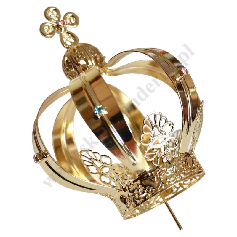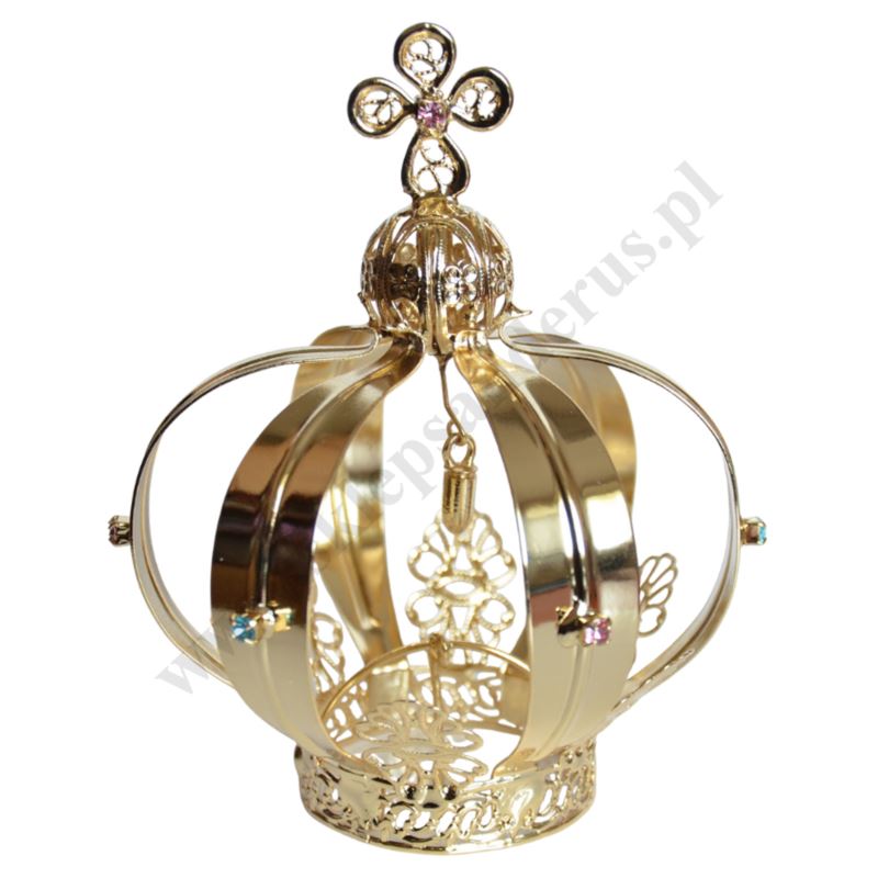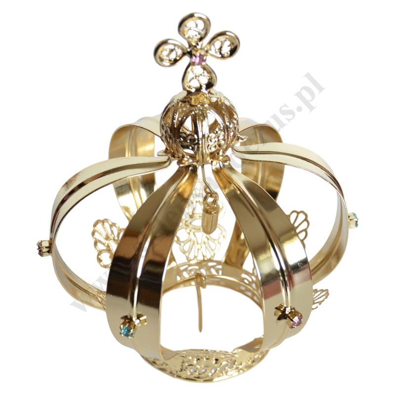 Korona metalowa pozłacana zdobiona kamieniami o wysokości 13 cm do figury Matki Bożej Fatimskiej. Średnica korony przy styku z głową figury 5.2 cm, średnica zewnętrzna korony ok. 11 cm. UWAGA: KORONA MOŻE POSIADAĆ INNY KOLOR KAMYCZKÓW OZDOBNYCH.