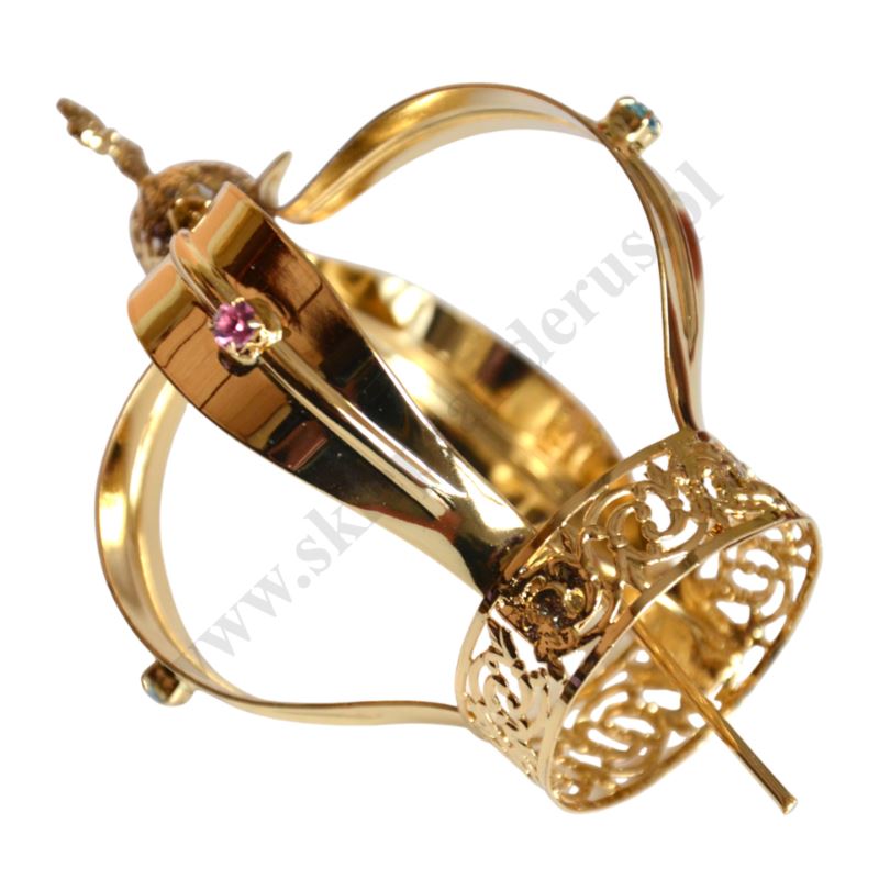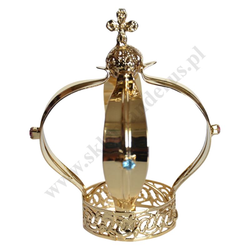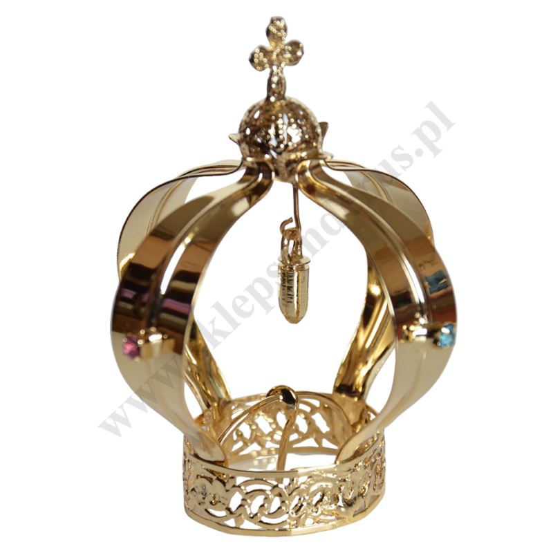 Korona metalowa pozłacana o wysokości 9 cm do figury żywicznej Matki Bożej Fatimskiej. Średnica korony przy styku z głową figury 3.6 cm, średnica zewnętrzna korony 7.5 cm. UWAGA: KORONA MOŻE POSIADAĆ INNY KOLOR KAMYCZKÓW OZDOBNYCH.