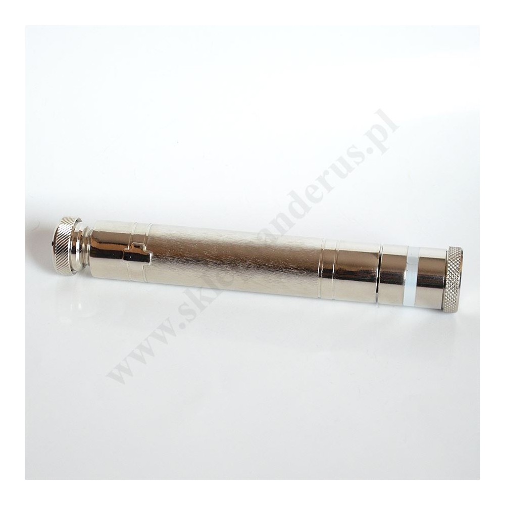 Krpoidło metalowe w etui z wbudowanym pojemnikiem na olej święty infirmorum (olej chorych). Długośc kropidła 17.5 cm, średnica kropidła 2.7 cm.