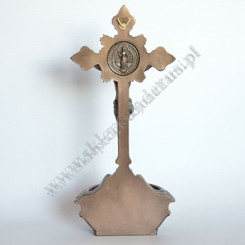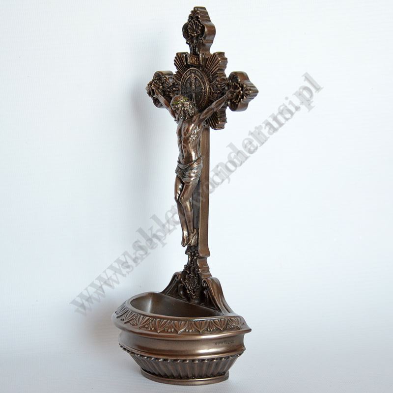 Kropielnica o wysokości 24 cm, szerokości 10.8 cm i głebokości 6.3 cm, wykonana z poliresingu czyli konglomeratu żywicy, mączki alabastrowej i ceramicznej, pokryta brązem.