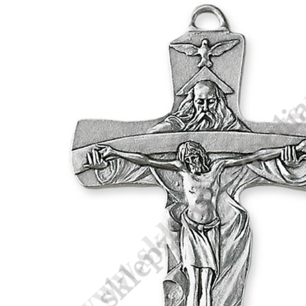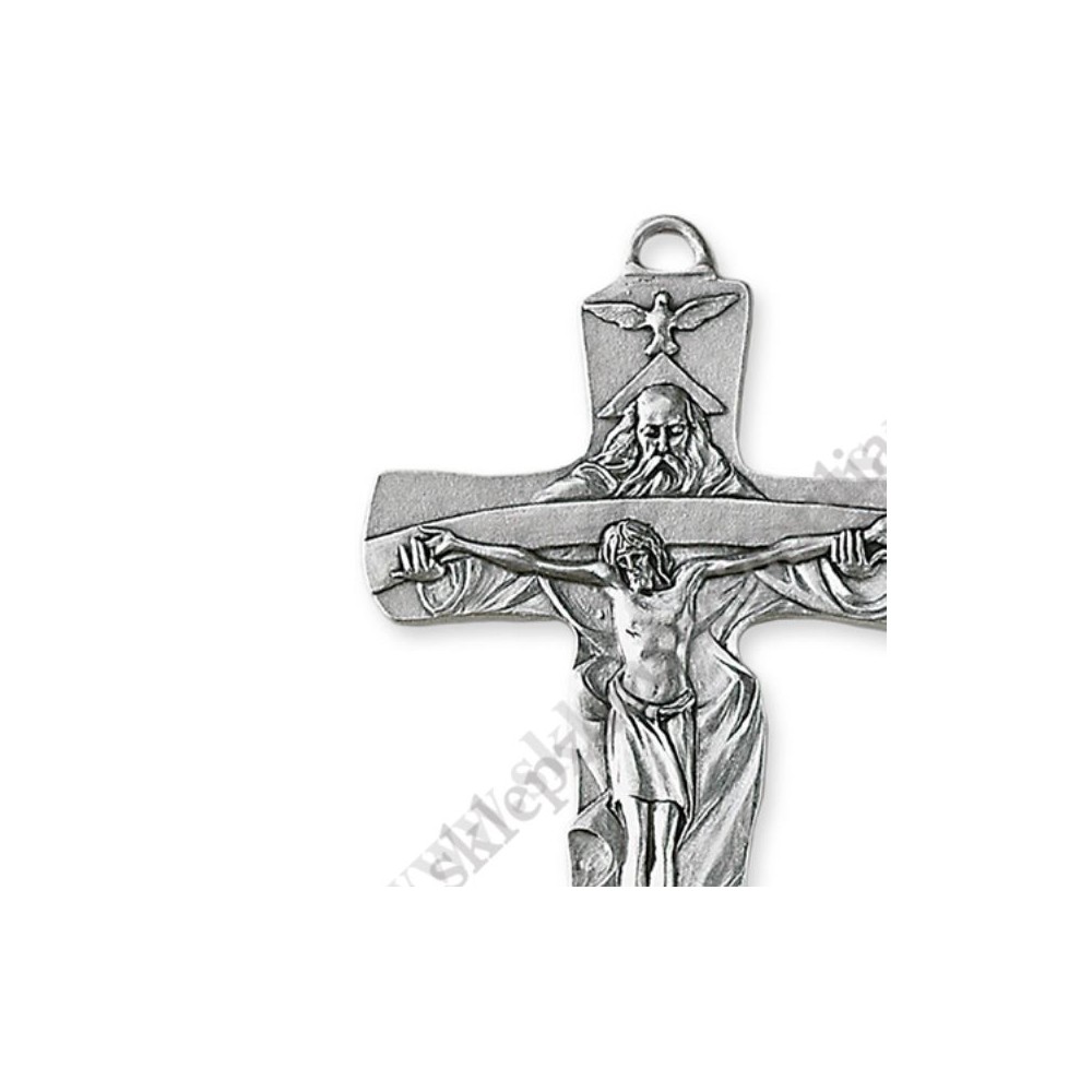 Krzyżyk metalowy „Trójca Święta” o wysokości 6.5 cm w kolorze srebrnym, oksydowany.
