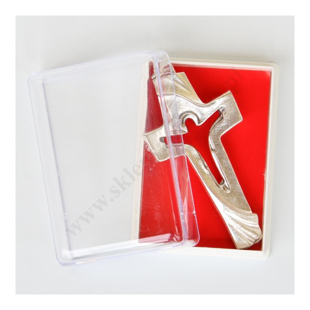 Metalowy krzyżk ażur o wysokości 8 cm i szerokości 4 cm w plastikowym pudełku.