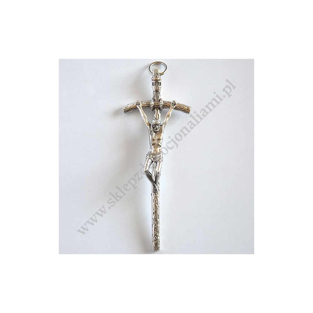 Metalowy krzyżyk papieski o wysokości 11 cm i szerokości ramion 4.3 cm.