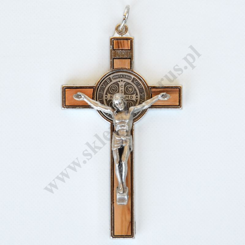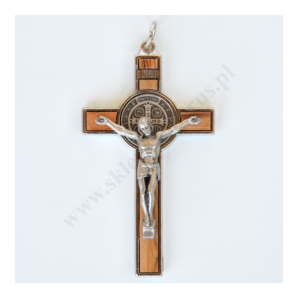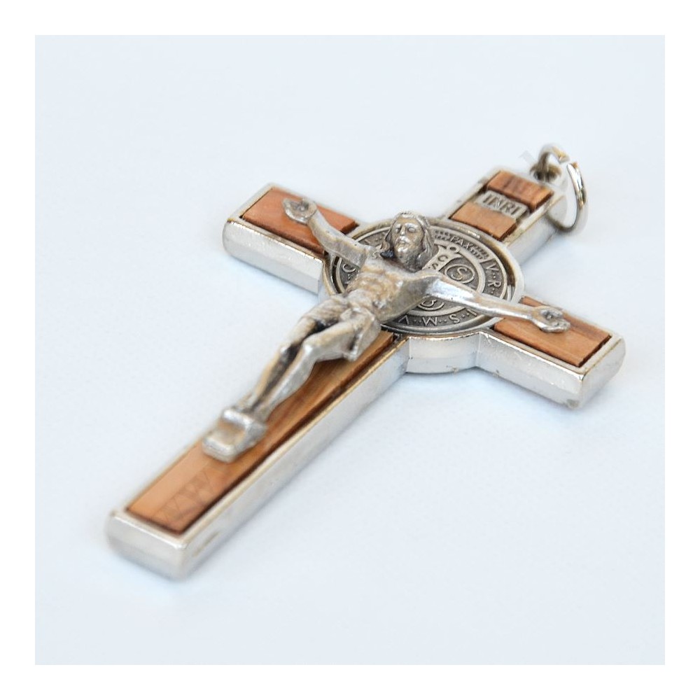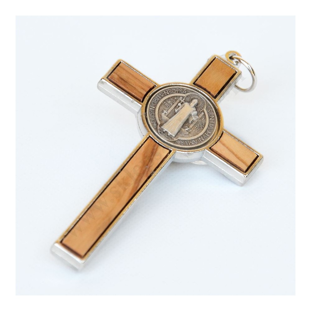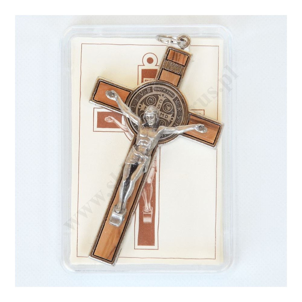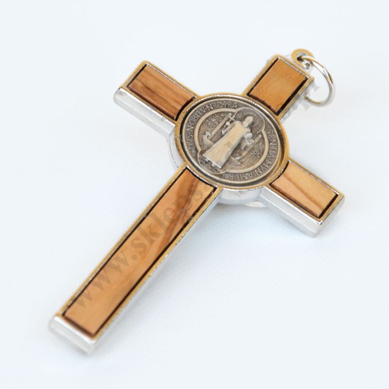 Krzyżyk Świętego Benedykta wykonany z drewna oliwnego i metalu o wysokości 7.5 cm i szerokości 4.3 cm. Krzyżyk w plastikowym pudełeczku.