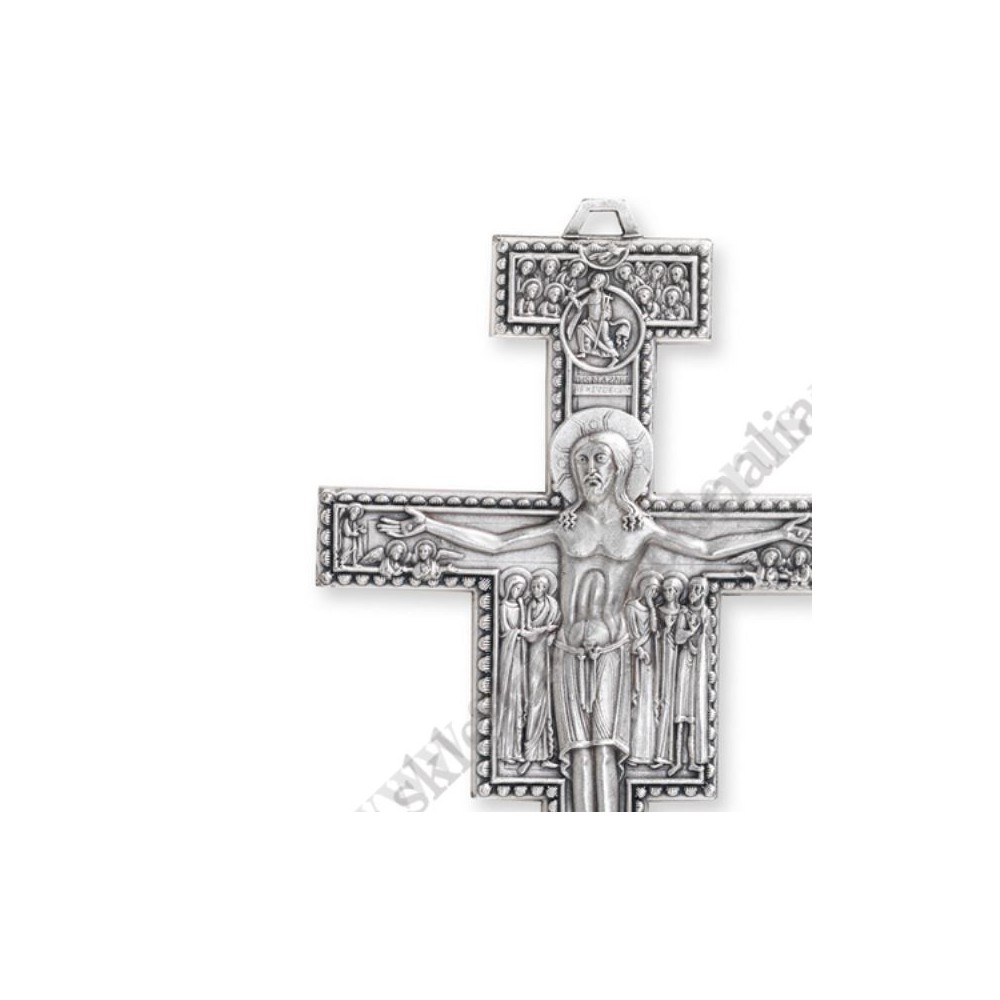 Krzyż Świętego Franciszka o wysokości 5.8 cm wykonany z metalu w kolorze srebrnym, oksydowany.