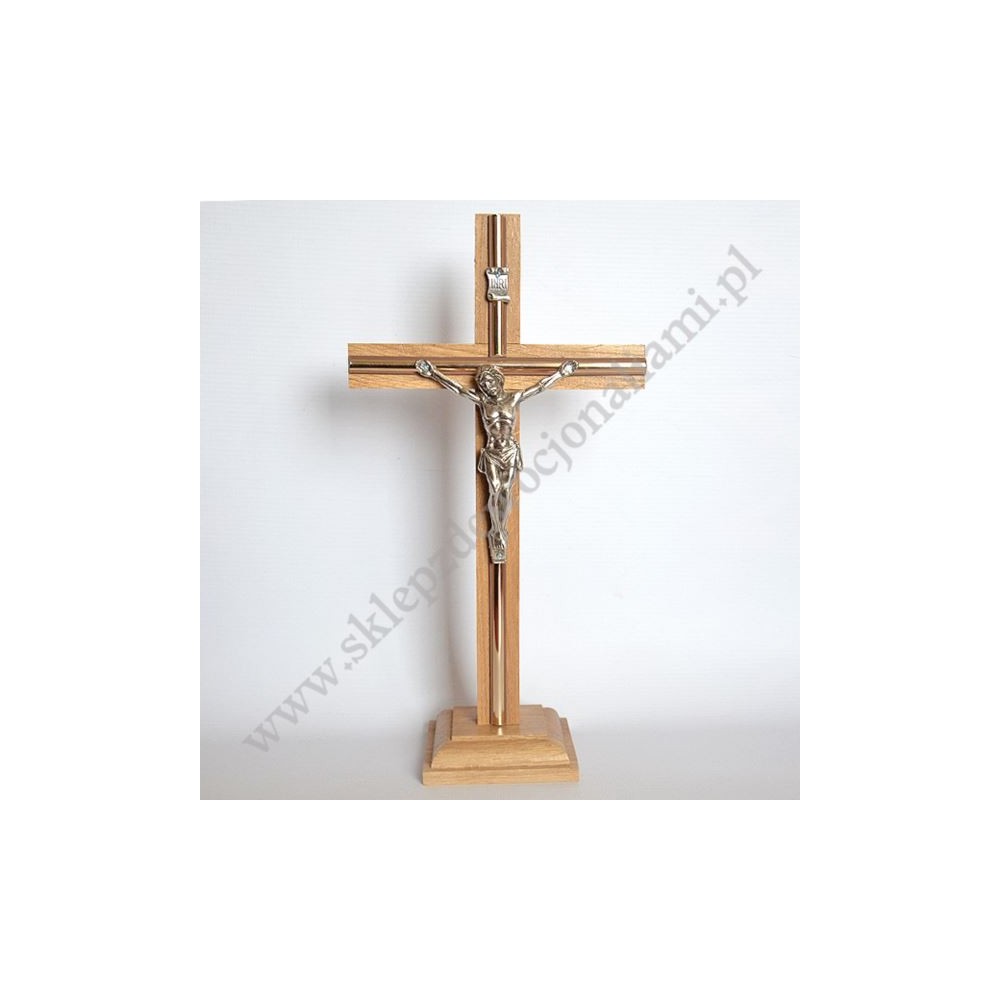 Drewniany krzyż stojący z metalową wstawką o wysokości 32.5 cm i szerokości 17 cm z metalowym korpusem Pana Jezusa o wysokości 12 cm.