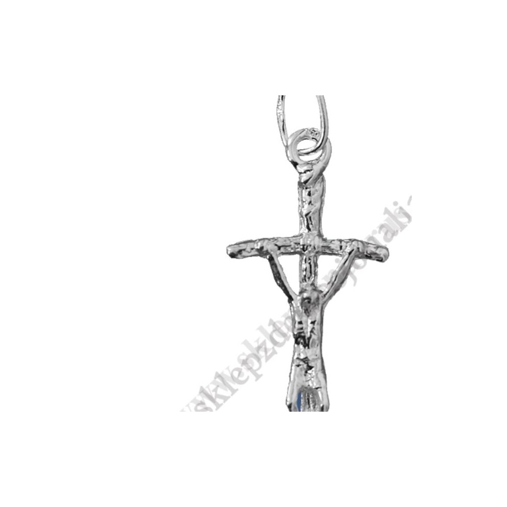 Srebrny krzyżyk papieski o wysokości z uszkiem 3.9 cm, szerokość krzyżyka 1.5 cm, waga 1.7 g, próba srebra PR 925.