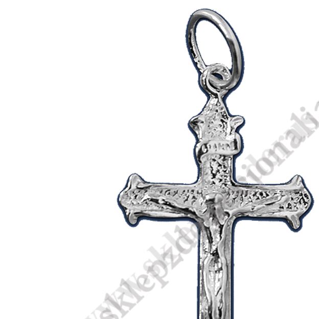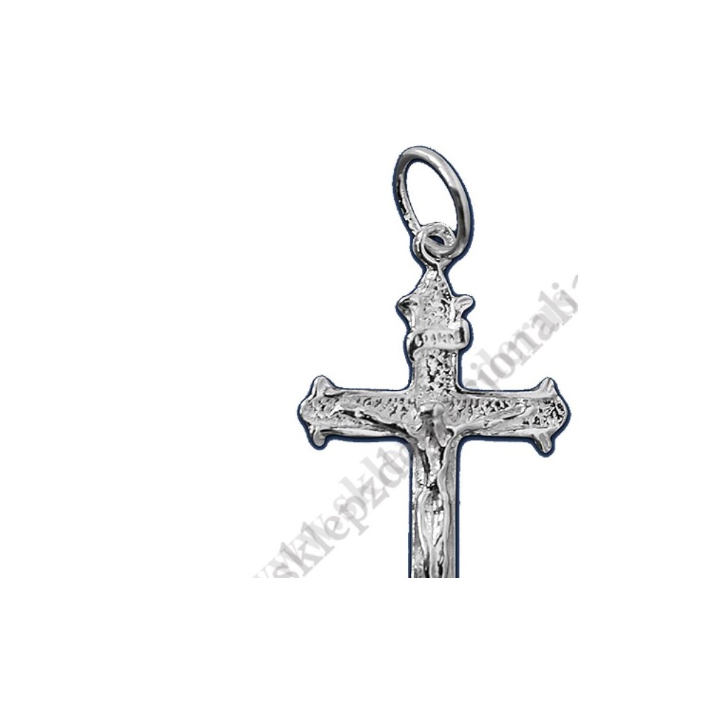 Srebrny krzyżyk o wysokości z uszkiem 3.8 cm, szerokość krzyżyka 1.9 cm, waga 2.3 g, próba srebra PR 925.