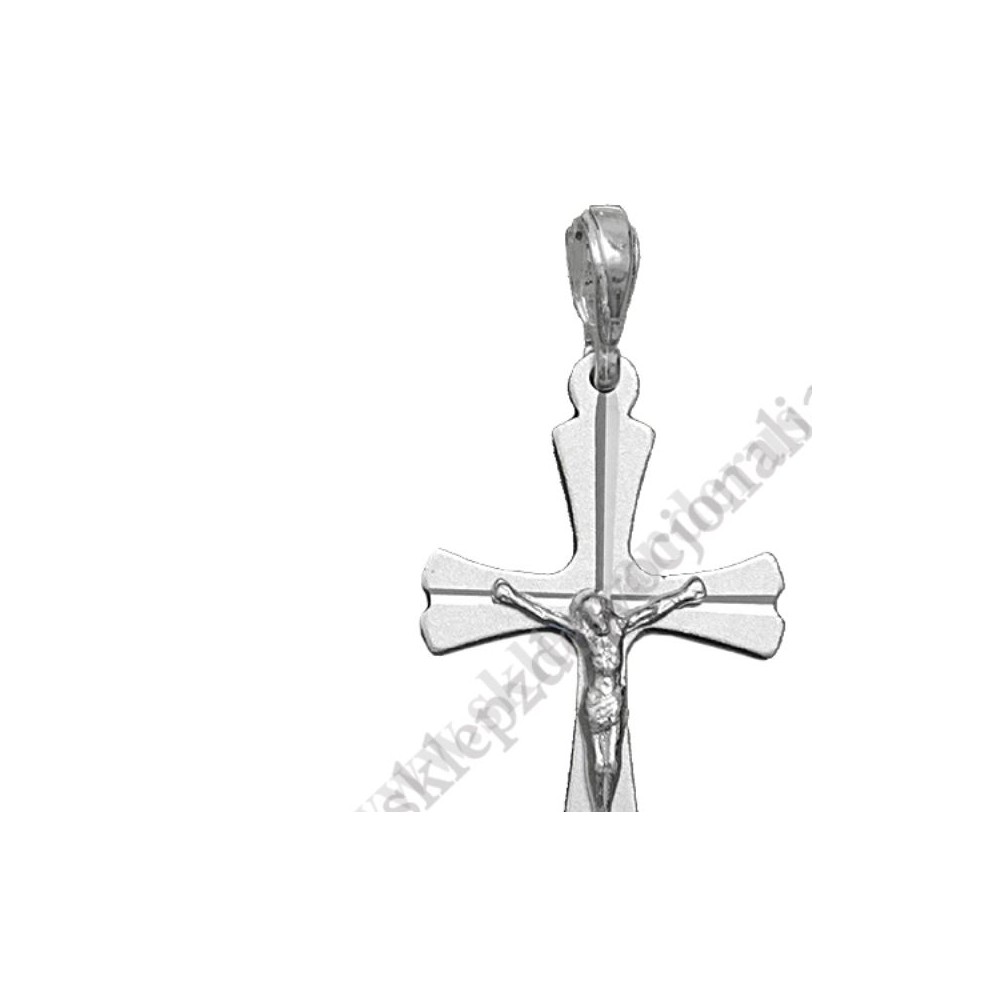 Srebrny krzyżyk diamentowany o wysokości z uszkiem 4 cm, szerokość krzyżyka 1.8 cm, waga 1.7 g, próba srebra PR 925.