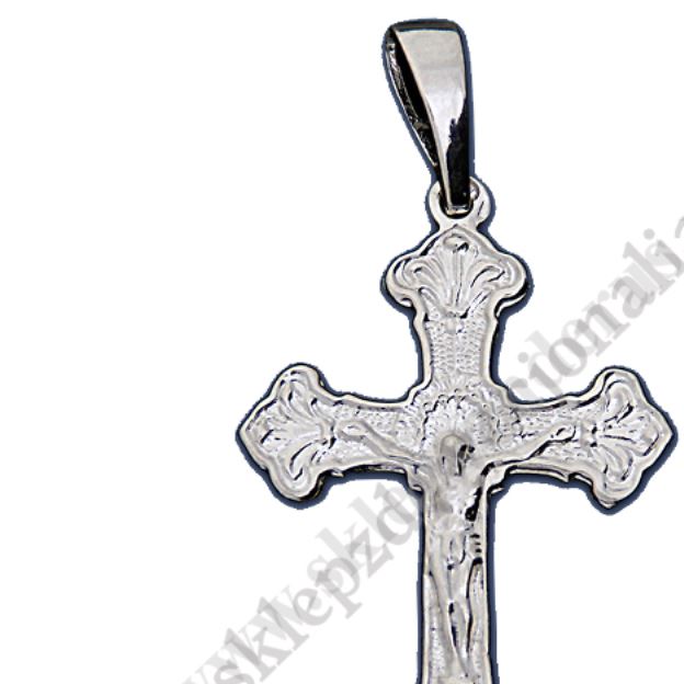 Srebrny krzyżyk o wysokości z uszkiem 5.5 cm, szerokość krzyżyka 2.8 cm, waga 3.6 g, próba srebra PR 925