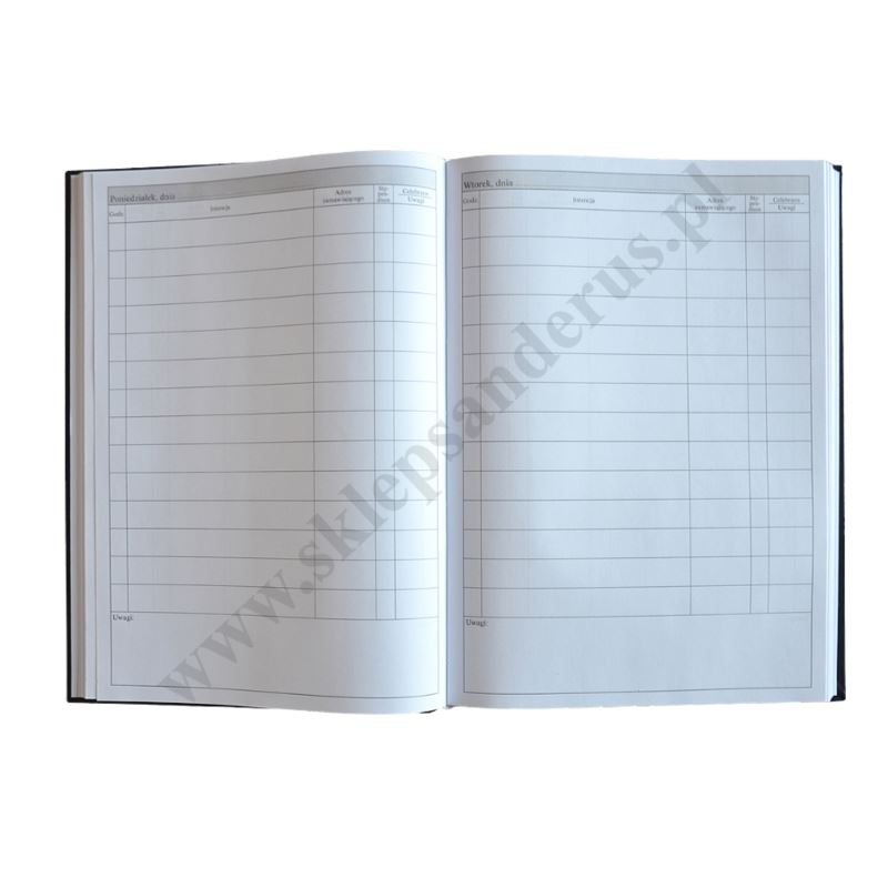 Księga do wpisywania przyjętych intencji Mszy Świętych. Wersja na 1 rok: 54 tygodnie, jeden dzień na jednej stronie, 14 intencji na każdy dzień i miejsce na uwagi. Zawiera wszystkie niezbędne rubryki, aby wpisać: datę i godzinę Mszy, treść intencji, adres zamawiającego, wysokość ofiary, podpis celebransa i uwagi. Format A4, szyta (trwała) i estetycznie oprawiona w sztywną okładkę. Księga posiada 380 stron.