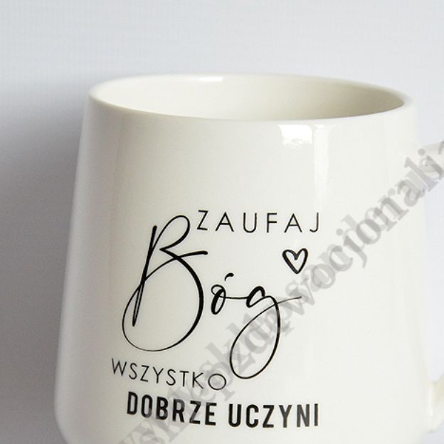 Kubek z tekstem "Zaufaj Bóg wszystko dobrze uczyni".
