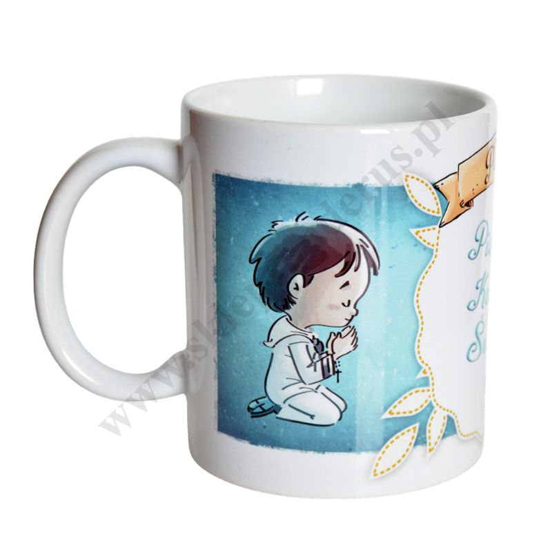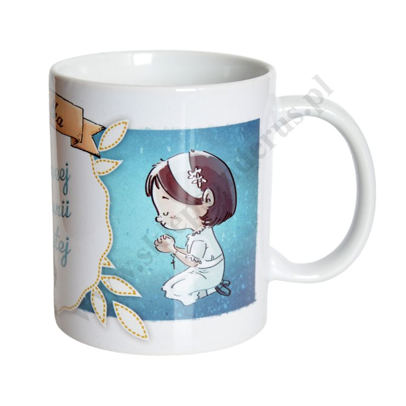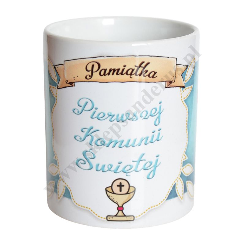 Kubek komunijny z uchem o wysokości 9.5 cm i szerokości 12 cm.