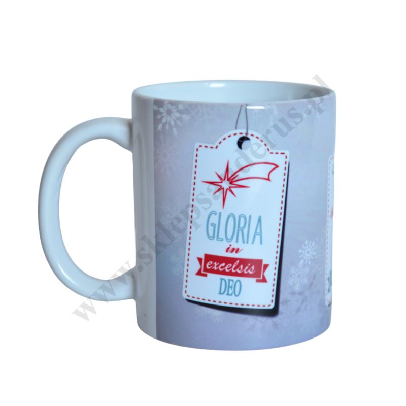 Kubek z tekstem "Narodził się nam Zbawiciel". Szerokość z uchem 12 cm, wysokość 9.5 cm.