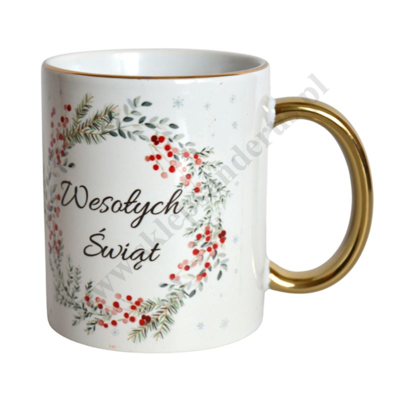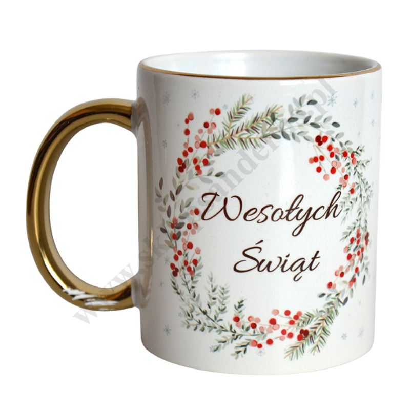 Świąteczny kubek z napisem "Wesołych Świąt". Sprzedaż w miksie wzorów.