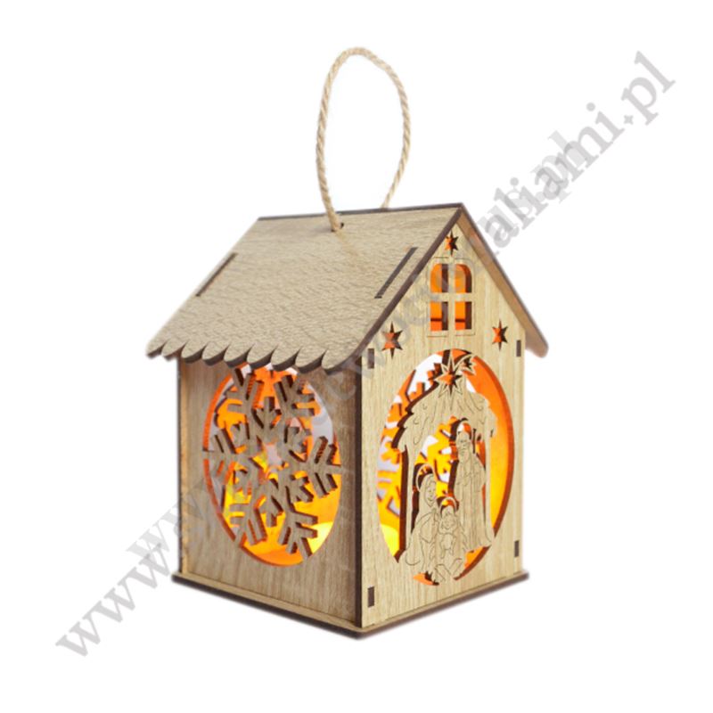 Lampion roratni wykonany z drewnianej sklejki o wysokości 14 cm, szerokości 12.3 cm i głębokości 10.4 cm. W komplecie znajduje się lampka led imitująca palącą się świecę, wraz z baterią.